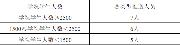 1.自主申报,学院初选:申报人将申请表、相关证明材料、获奖证书复印件等上交学院辅导员,由各学院组织初选并向评委会进行推送,每类型在推选人数根据学院学生总人数进行分配,分配规则如下: