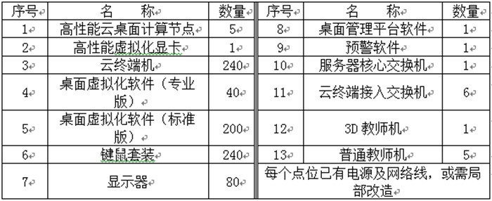 本项目针对6间新建云桌面机房,其中1间40点位3D机房,5间各40点位普通教学机房,解决方案采用云桌面模式,所有的操作系统、应用软件全部部署于云端,此次建设必须满足学校各专业实验课程教学及计算机等级、ATA等考试。