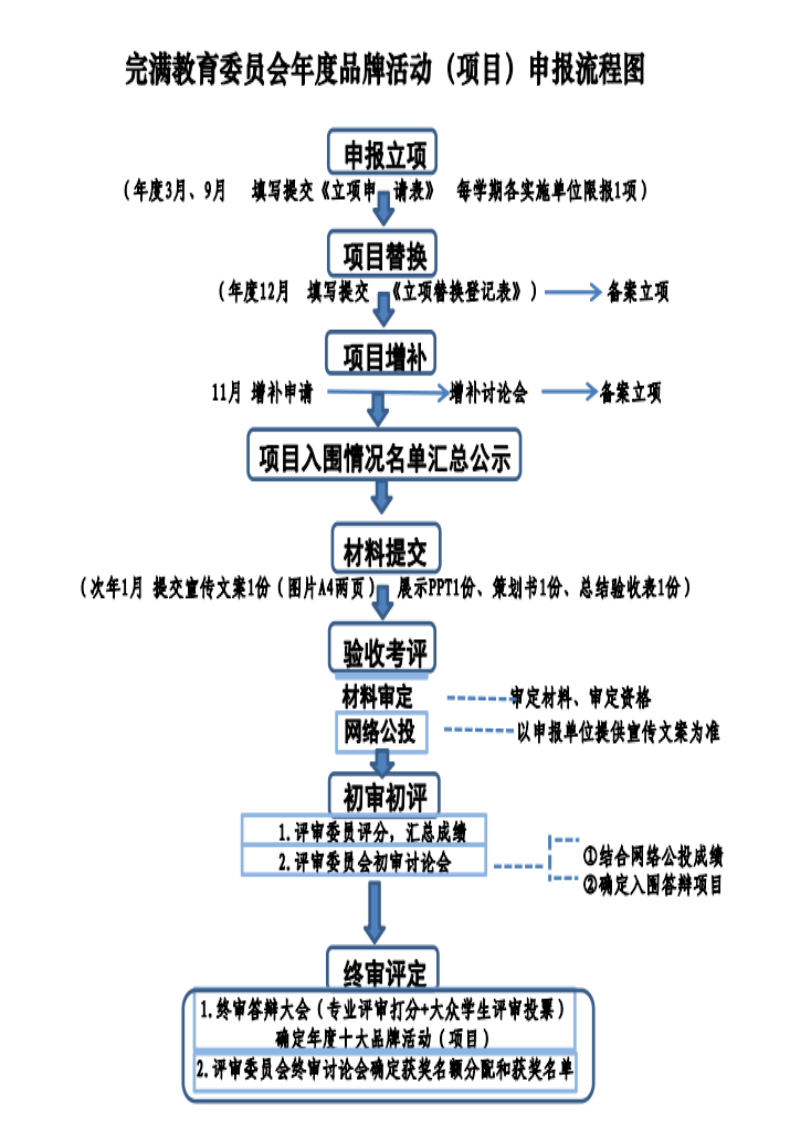 品牌活动(项目)立项评比工作指每个自然年度在全校范围内通过自主申报,并经过完满教育委员会评审确定评审10个完满教育品牌活动(项目),如参评的品牌活动(项目)没有达到品牌活动(项目)要求,评选标准将按照宁缺毋滥原则进行评选。