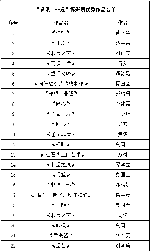 “遇见·非遗”非遗主题摄影展主办方公示获奖名单公示期间,组织方收到反馈,有投稿作品出现整理遗漏现象。接到反馈后,主办方立即组织人员核实,并组织评委会针对遗漏投稿重新进行重新评分、重新排名。经过公平、公正、公开评审,最终确定22幅/组作品获得大赛优秀作品奖。现将最终获奖名单公示如下: