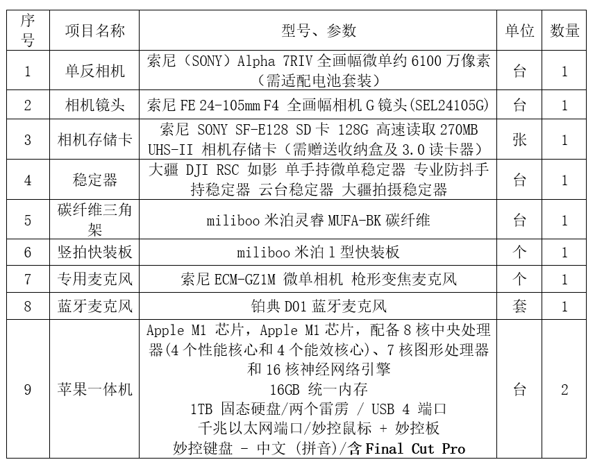 根据《中华人民共和国政府采购法》《中华人民共和国招标投标法》等有关规定,重庆移通学院綦江校区对瀛洲科幻学院影视制作设备采购项目进行公开招标。诚邀有实力、有信誉、供货能力强和售后服务好的商家进行报价。