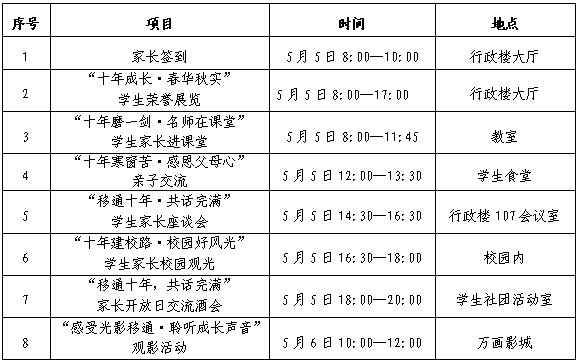 您的孩子在移通学院经历了一段时间的学习生活,已对大学有所体验,他在学校生活得如何?学习得怎么样?是每一位家长的心中挂念,值此移通学院十周年校庆之际,为了更好地让学生家长们了解孩子在学校的学习生活情况,了解学校的办学理念和学生发展前景,从而与学校形成合力,帮助学生更好地成长,我校通信与信息工程系决定于2017年5月5日—5月6日举行家长开放日活动。届时学校将把自己全新的教育理念、独特的办学优势、先进的教学条件、优质的教育服务全方位地向家长展示,搭建起学校领导、老师、家长和学生的零障碍交流平台,也将有内涵丰富的各类活动,诚挚欢迎各位家长莅临。我们真诚地希望,家长开放日不仅是一次形象的展示、成果的检阅,更能够成为一次情感的交流和心灵的对话。尊敬的家长朋友们,愿我们同心协力,见证你们每个孩子、我们每个学生的成长成才!