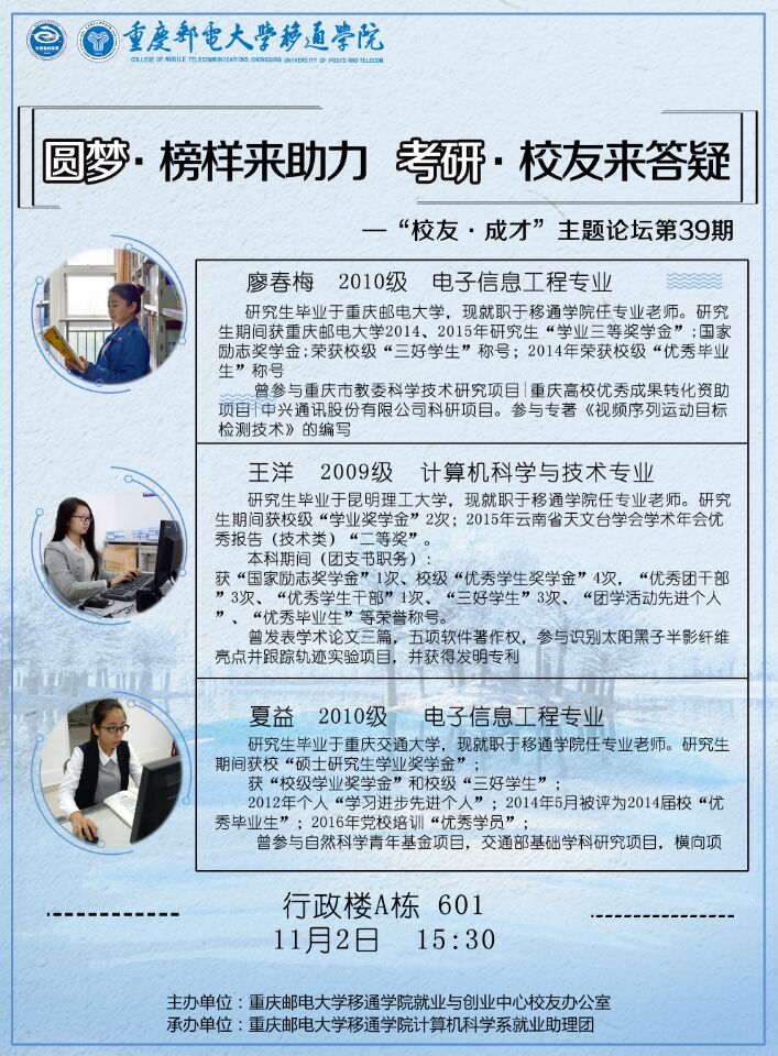 曾是移通之子,现为移通之师。我们有幸邀请到了3位优秀嘉宾。一位是学术专研专才,大学期间专业成绩名列前茅,是校级“三好学生”称号、国家励志奖学金的连续获得者,重庆邮电大学研究生-----2010级廖春梅学姐;一位是以技术为主流,精通各类通信技术与计算机技术,有着丰富的专业知识,还是一位富有有爱心与责任心青年志愿者-----2010级夏益学姐;另一位是有着很高的学术研究达人,她有着自己的发明专利,曾发表多篇学术论文、著作各类软件系统等-----2010级王洋学姐。她们之所以这么优秀,肯定有着自己的方法与经验,那你想借鉴吗?她们都是研究生毕业,那定然知道考研过程中遇到的问题,你可能会遇到。曾经,她们跟我们一样是移通学子,而现在是移通教师。也许你听了他们的讲解,你就从小白懂得了要怎样变成大神,从自己的困惑中走出,听了她们的讲解,你不会再犹豫不决,当然你更不会因为考研而害怕考研。也许,听了她们的讲解,下一个从移通走出去到更大的世界的那个人就是你,还在犹豫什么?
