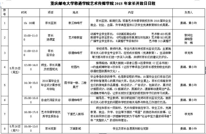 尊敬的家长朋友: 您好! 感谢您对移通学院一直以来的信任和支持,学生的成长成才需要家庭、学校和老师的通力合作才能更好的实现。为了让您更好的了解学校的办学理念与特色和您孩子在学校的学习生活情况,共同促进孩子的成长,艺术传媒学院拟定于2018年5月25日—5月26日举行家长开放日活动,我们诚挚欢迎您的莅临。届时您将切身感受我校致力培养“完整的人”的教育理念及“三位一体”人才培养模式、体验我校优质的教育资源和感受形式多样、内涵丰富的特色校园文化活动氛围。