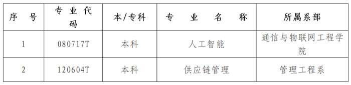 根据《关于做好2019年高等学校新专业设置工作的通知》(渝教办函〔2019〕228号)文件要求,学校组织了2019年新专业申报工作。经学校审议,拟申报人工智能、供应链管理等2个普通本科专业,现公示如下: