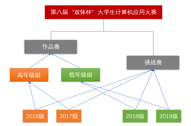 本届大赛除传统的作品赛之外,新增挑战赛。作品赛设置高年级组、低年级组两个比赛组别,其中高年级组为2016级、2017级学生,低年级组为2018级、2019级学生,若高低年级混合组队则只能参加高年级组。挑战赛不设置比赛组别,高低年级可随意组队参赛。