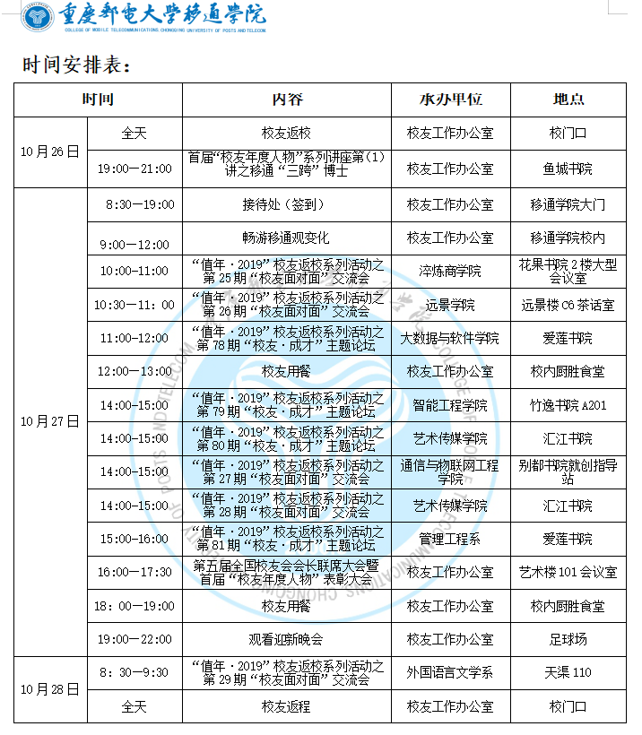 为了增进校友与母校感情,加强校友与母校的联系,培养校友对母校的归属感,我校将于10月27日举办“值年·2019”校友返校系列活动,同时迎来第五届全国校友会会长联席大会和首届“校友年度人物”表彰大会,届时各届优秀校友将返校交流,并观看2019年迎新晚会,感受、回忆当年那些青涩的大学时光,为校友及在校学生创造一个交流的平台。