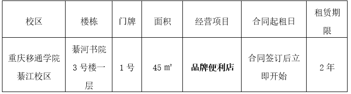 为更好的服务广大师生,满足学生生活需求,完善学校商业布局,提升商业品质,经学校研究决定,本着“公平、公开、公正”的原则,对重庆移通学院綦江校区綦河书院3号楼一层1号房公开招商,诚邀符合资格条件的潜在投标人参与投标。
