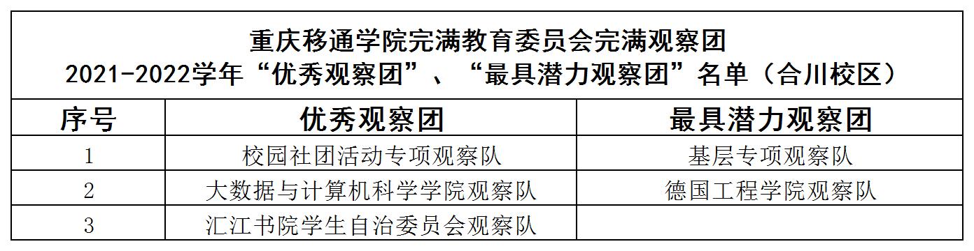 完满观察团作为完满教育活动质量提升的工作的骨干力量之一,在完满教育活动和工作开展中发挥着不可忽视的作用。为推动完满教育更稳、更快、更好的开展,同时加强观察团团队建设,激励各观察员、在以后工作中更积极踊跃的发挥“温度计”的本色作用,现将2021-2022学年“优秀观察员”、“优秀指导老师”、“优秀观察团”和“最具潜力观察团”评选结果公示如下: