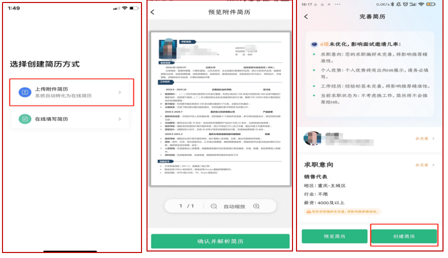 根据流程引导,上传简历附件并解析,根据简历解析情况,完善简历内容;(附件简历格式必须为Word或PDF格式,为方便上传,请同学们将文档提前存储至手机文件);