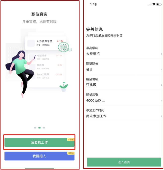 根据引导选择“我要找工作”,完成学历及岗位信息填写。(参加工作时间请选择“尚未参加工作”)