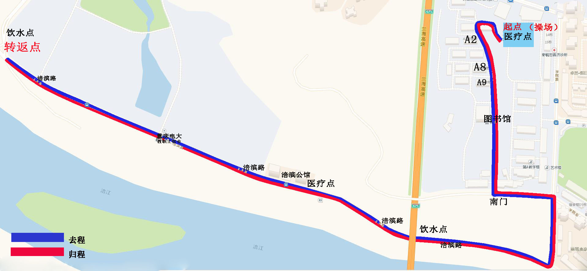 校田径场——A2宿舍楼——校图书馆——南校门出口——滨江路路口——涪滨路——中转点——原路返回——校田径场(路线图见附件)
