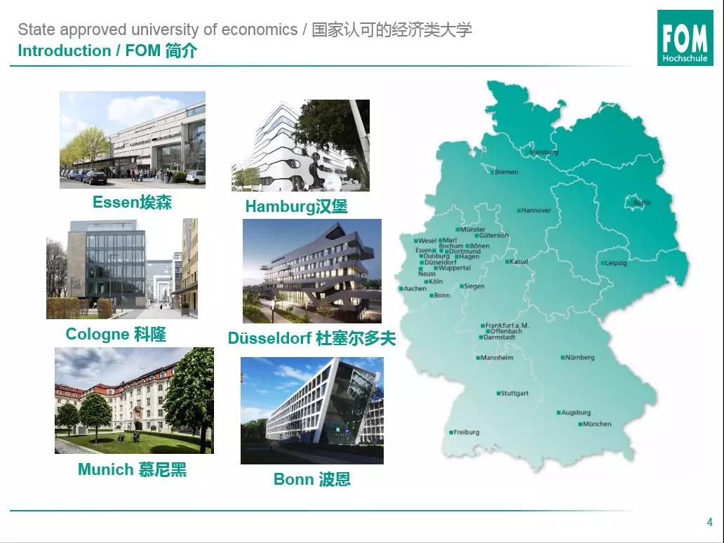 FOM大学是德国富有影响力的商学院,在校生5万余人,校园环境优美,师资力量雄厚。功能齐全的教学设备、现代化授课方式和贴心的服务管理,使得学生拥有非常高的满意度。该校在我国教育部教育涉外监管信息网公布的德国大学之列。FOM大学经中国教育部批准和同意,于2002年开始与中国高校合作办学联合培养硕士研究生,颁发的硕士学位文凭,得到中国政府认可,同时也被全世界所承认。在华举办中德合作办学以来,已有4000余名本科生和800余名硕士生顺利毕业并取得学位,他们就业遍及德中各行业的知名公司,如大众汽车、西门子、国航、中国银行等。