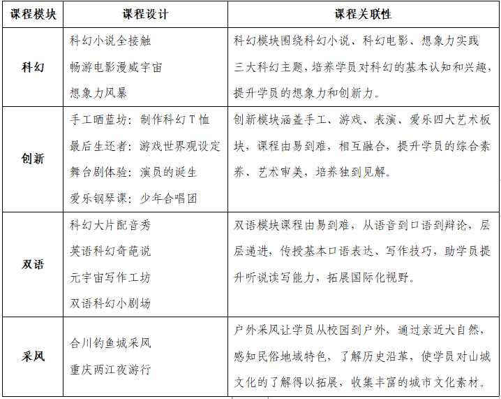 项目特色:夏令营打造独有课程体系,涵盖四大课程,以科幻课为主,创新课为亮点,辅以双语课与户外采风课。每个模块的课程由易到难,层层递进,课程输入和输出相结合;各个模块相互融合,环环相扣,授课主题跨模块,在结业前进行成果验收和汇报演出,确保学员跨模块融合学习成果。