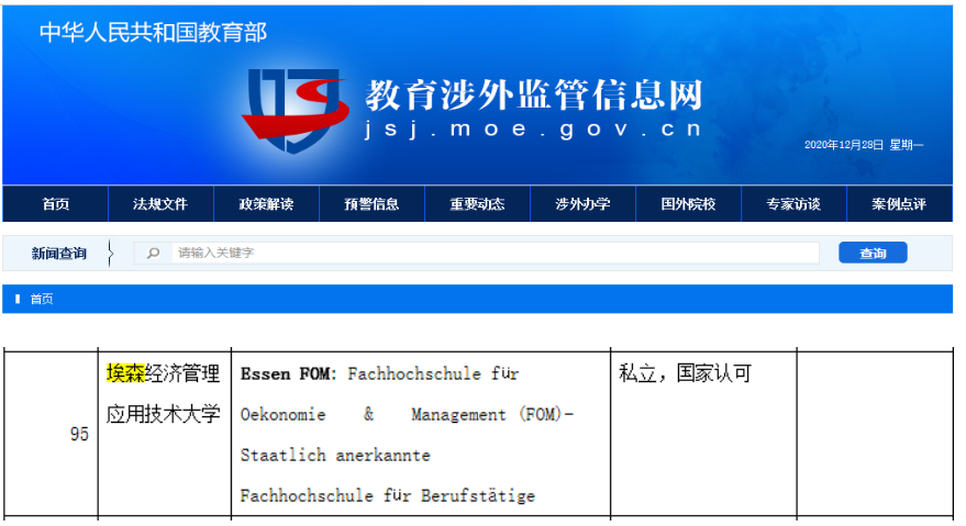 根据“中德政府关于相互承认高等教育等值的协定”和中国教育部涉外监管网公布的德国大学名单中,FOM大学位例其中,其颁发的硕士学位文凭,得到中国政府认可,同时也被全世界所承认。