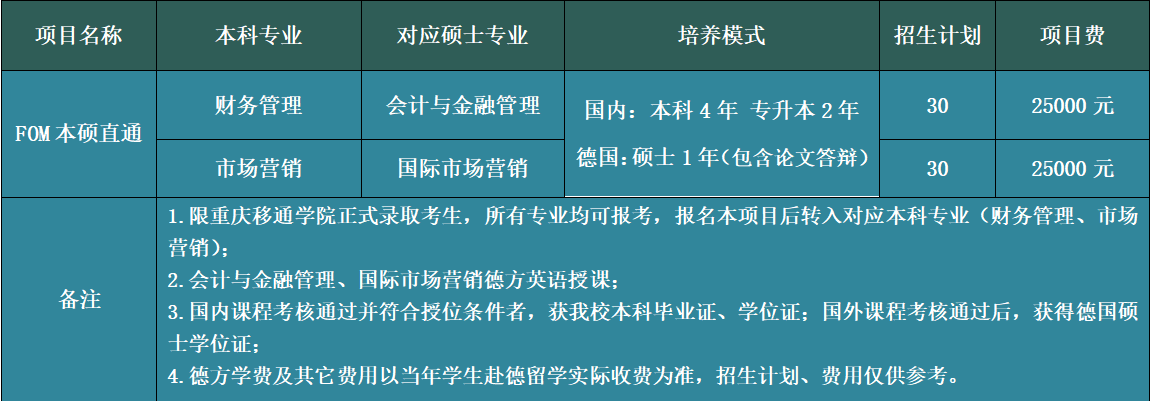 FOM4+1本硕直通项目介绍:本项目为德中联合培养的4+1本硕直通硕士项目。其中,本科4年及管理强化课程由重庆移通学院国际商学院负责,德方埃森经济管理应用技术大学负责1年的国外硕士培养,学生毕业后可获得全球通用、中国教育部认可的文科硕士学位(Master of Arts)。