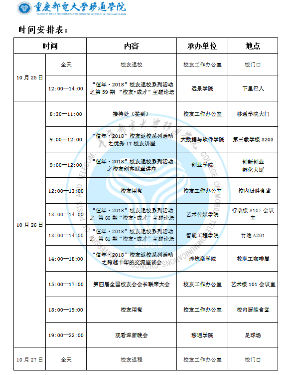 为了增进校友与母校的感情,加强校友与母校的联系,培养校友对母校的归属感,我校将于10月26日举办“值年·2018”校友返校系列活动,同时迎来第四届全国校友会会长联席大会,届时各届优秀校友将返校交流,并观看2018年迎新晚会,感受、回忆当年那些青涩的大学时光,为校友及在校学生创造一个交流的平台。