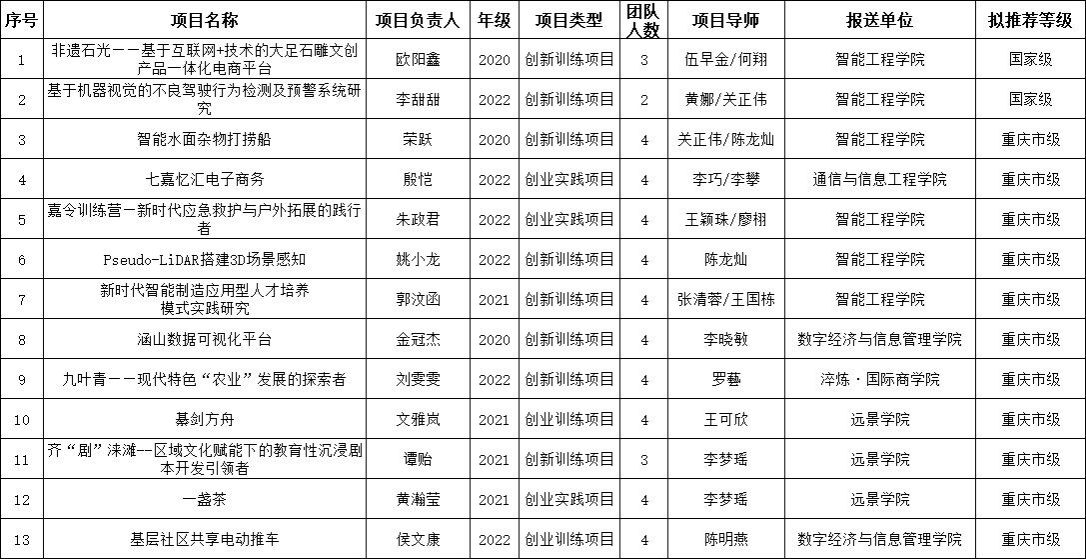 根据《重庆市教育委员会关于组织开展2023年大学生创新创业训练计划立项和结题验收工作的通知》文件精神,做好大学生创新创业训练计划项目的申报工作,我校2023年大学生创新创业训练计划项目的选拔工作已经圆满结束,秉着“公平、公正、公开”的原则,经过评委的综合评定,拟推荐《非遗石光——基于互联网+技术的大足石雕文创产品一体化电商平台》、《基于机器视觉的不良驾驶行为检测及预警系统研究》2个项目为国家级项目,《智能水面杂物打捞船》等11个项目为重庆市级项目。现将具体的项目名单及推荐等级公示如下:
