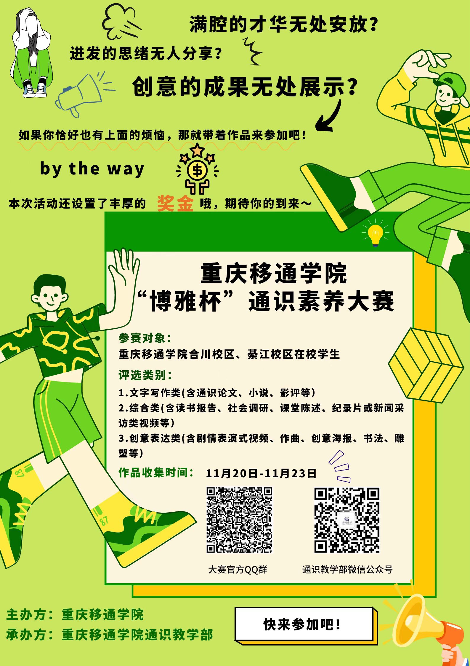 通识教育作为重庆移通学院“四位一体”人才培养体系中的重要组成部分,通过课程体系和育人平台培养学生的通用能力和核心素养。为进一步落实“以学生为中心”的教育理念,发挥学生的主动性,帮助学生将知识翻转为问题,将问题翻转为思考,将思考翻转为方案,将方案翻转为行动,在思考和实践中培养学生的批判性思维、跨学科认知和沟通与表达能力,重庆移通学院通识教学部将举办学校“博雅杯”通识素养大赛,相关通知如下。