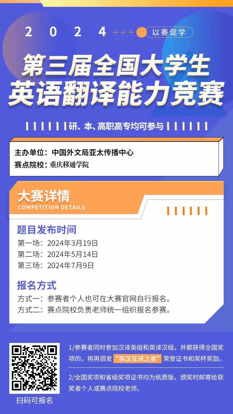 为贯彻落实教育部《关于加快建设高水平本科教育全面提高人才培养能力的意见》等文件精神,激发大学生学习英语的兴趣,促进大学生英语翻译能力发展,为全国在校大学生提供展示英语翻译水平和能力运用的舞台,往届共有来自上海外国语大学、北京外国语大学、南开大学等1565所高校两万余的学生参与,特举办2024年第三届全国大学生英语翻译能力竞赛。