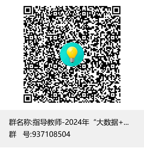 指导老师请加入QQ群:“指导老师-2024年“大数据+”新文科应用创新校赛”,群号:(或扫描下方二维码),入群请把群昵称改为学院-真实姓名。