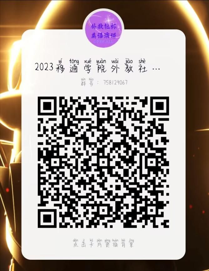 扫描二维码(见附件1,QQ群号:758129067)加入“2023-移通学院外教社杯演讲大赛”群,并填写在线报名表格。
