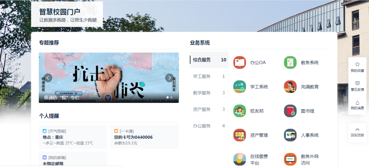 “智慧门户”平台具有校园办公、学习、生活等业务平台交互的功能。在统一身份认证的基础上,通过数据集成,打通各业务系统之间的壁垒,实现单点登陆,只需登陆一次即可访问办公OA、学工、教务、图书馆等多个核心业务系统。