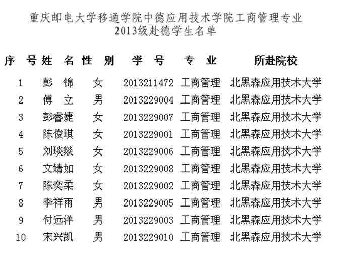 2016年6月30日重庆邮电大学移通学院中德应用技术学院工商管理专业2013级10名本科生顺利完成国内课程且通过出国考试,赴德学习深造,名单如下。
