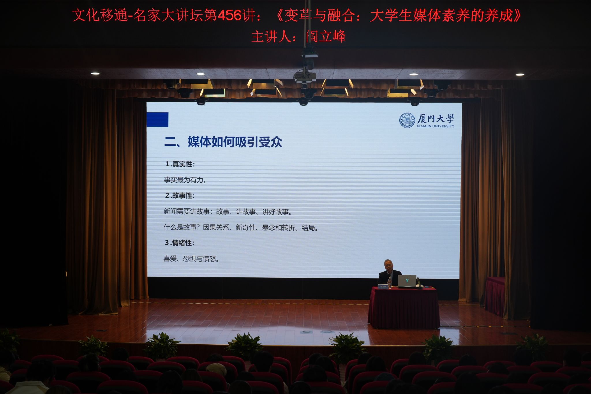 讲座从“什么是媒介”这个根本问题切入。阎立峰教授指出,有效的媒介传播需同时兼顾真实性与故事性——既要呈现事实,也要通过构建事实之间的因果或联想关系,通过举例“国王死了,王后也因伤心而死”,赋予信息以情节与温度。