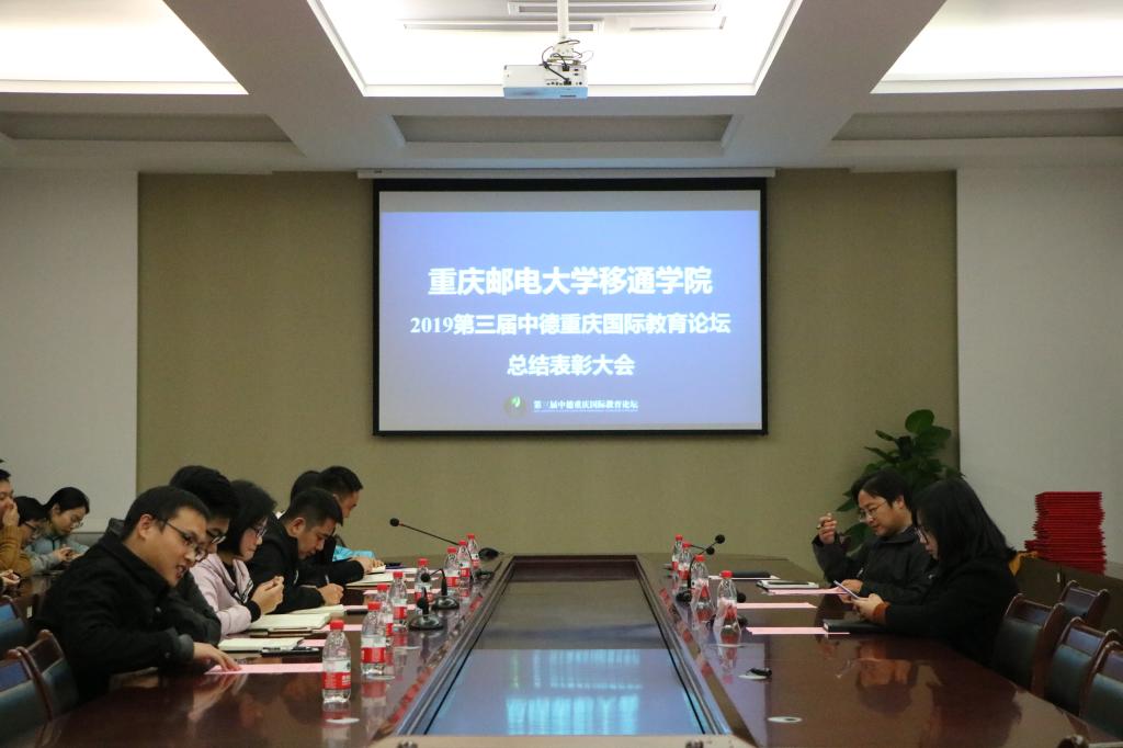 国际处副处长毛敏从聚力论坛筹备、聚焦论坛亮点、聚听论坛心声、聚合论坛经验四个方面对本届论坛进行总结汇报。据汇报,第三届中德重庆国际教育论坛自2018年10月启动筹备,经历了整整一年的准备时间,通过全面启动、全方位推进、全力冲刺三个阶段稳扎稳打,细致严谨推进论坛筹备工作。与往届相比,本届论坛呈现出六大亮点,亮点一:论坛规模再扩大,开启应用技术大学教育新篇章。本届论坛吸引了中外参会单位120家400多位嘉宾,12个议题、32个专题报告、5个分会论坛,与往届相比规模更大,参与人数更多,主题更加聚焦。亮点二:论坛主题有聚焦,深入交流共享人才培养新经验。紧扣全国高等学校本科教育工作会议、全国教育大会主题,议题比往届增多,体现出新时代新形势对高等教育的新要求。亮点三:立足学校“四位一体”发展战略,内容丰富提升国际交流新品牌。围绕国际商学院(FBS)、国际商学院专家委员会、德国课程体系研究中心的成立及建设为主题的商科分论坛,为移通学院的商科教育注入了国际力量,搭建了国际平台,进一步促进了国际交流与合作。亮点四:首次邀请优秀校友作主题分享,展现合作办学的质量和成果。开幕式上邀请到中德学院2011级电子信息工程专业、曾赴德留学校友、现任北京英博刻公司创始人兼CEO刘英杰作主题分享。亮点五:分论坛走进书院,论坛国际化与书院古典美相得益彰。亮点六:论坛组织有温度,用热情和细节彰显移通独特风采本届论坛在总结吸取前两届经验的基础上,提前部署,周密组织、保证了接待服务质量、提高了与会嘉宾的满意度。论坛结束后,组委会的工作人员纷纷收到来自国内外参会嘉宾们的积极正面反馈,表达对论坛组委会的感谢和赞许,对我们的会务组织的各方面给予了高度评价和肯定。更得到党报头条、中新网、搜狐网、华龙网、今日头条、重庆青年报、重庆晨报等几十家外媒报道。