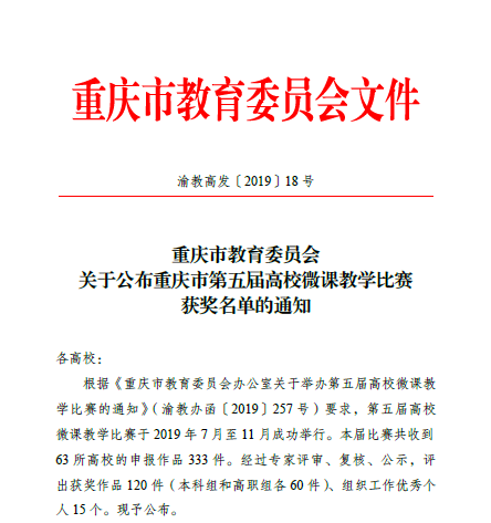 重庆市第五届高校微课教学比赛由市教委主办,市高教学会、市教育技装中心承办,重庆高校在线开放课程平台、昭信教育研究院协办。本届大赛依托“重庆高校在线开放课程平台”组织开展。