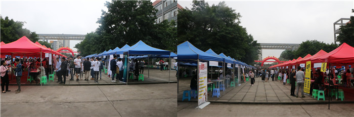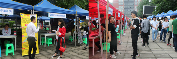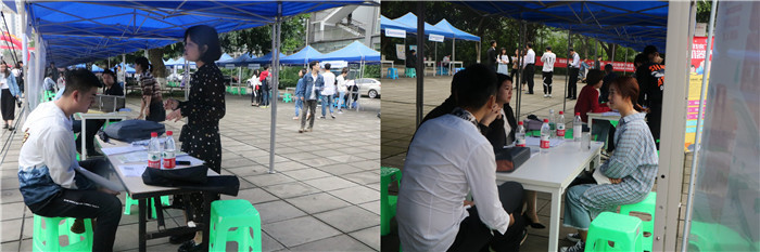 上午十点半,双选会正式开始。本次双选会吸引了重庆亿特科技有限公司、云闪大数据有限公司等多家国有、民营企业。各个企业有条不紊的进行准备活动,多样的招聘传单也递达到毕业生手里。毕业生则带着自己精心准备的简历和应聘材料来到招聘现场,积极地展示自我。他们和企业的招聘负责人进行了面对面交流,提出自己的疑惑,咨询了公司情况和岗位职责、要求等问题,HR们也热情为同学们答疑解惑,针对性挑选符合企业条件的人才。在一个个帐篷的紧密相连下,热闹的招聘气氛无形之中带来偌大竞争力,使得毕业生们积极、努力的向心仪企业展现自己。