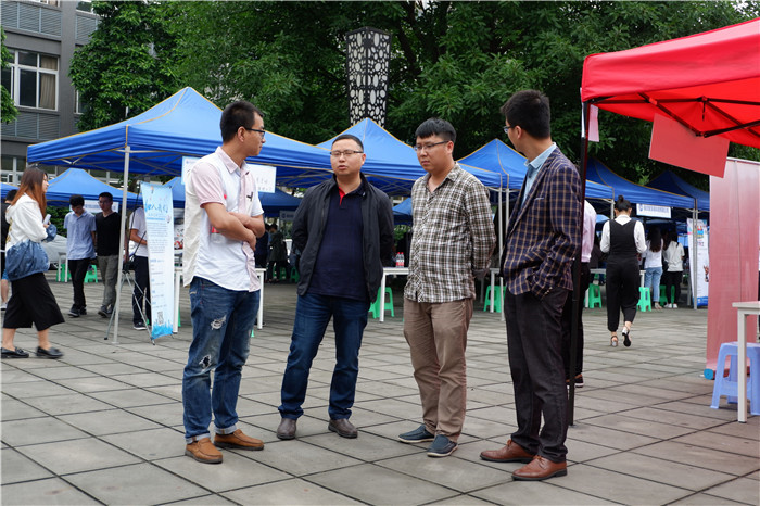 双选会期间,重庆市大学中专毕业生就业指导与服务中心信息与市场部尹亮部长亲临我校双选会现场指导工作,重庆邮电大学移通学院院长助理周伟老师、就业创业指导与服务中心主任陈仲华老师同时来到招聘会现场,与用人单位代表进行亲切交谈并对用人单位的到来表示感谢。