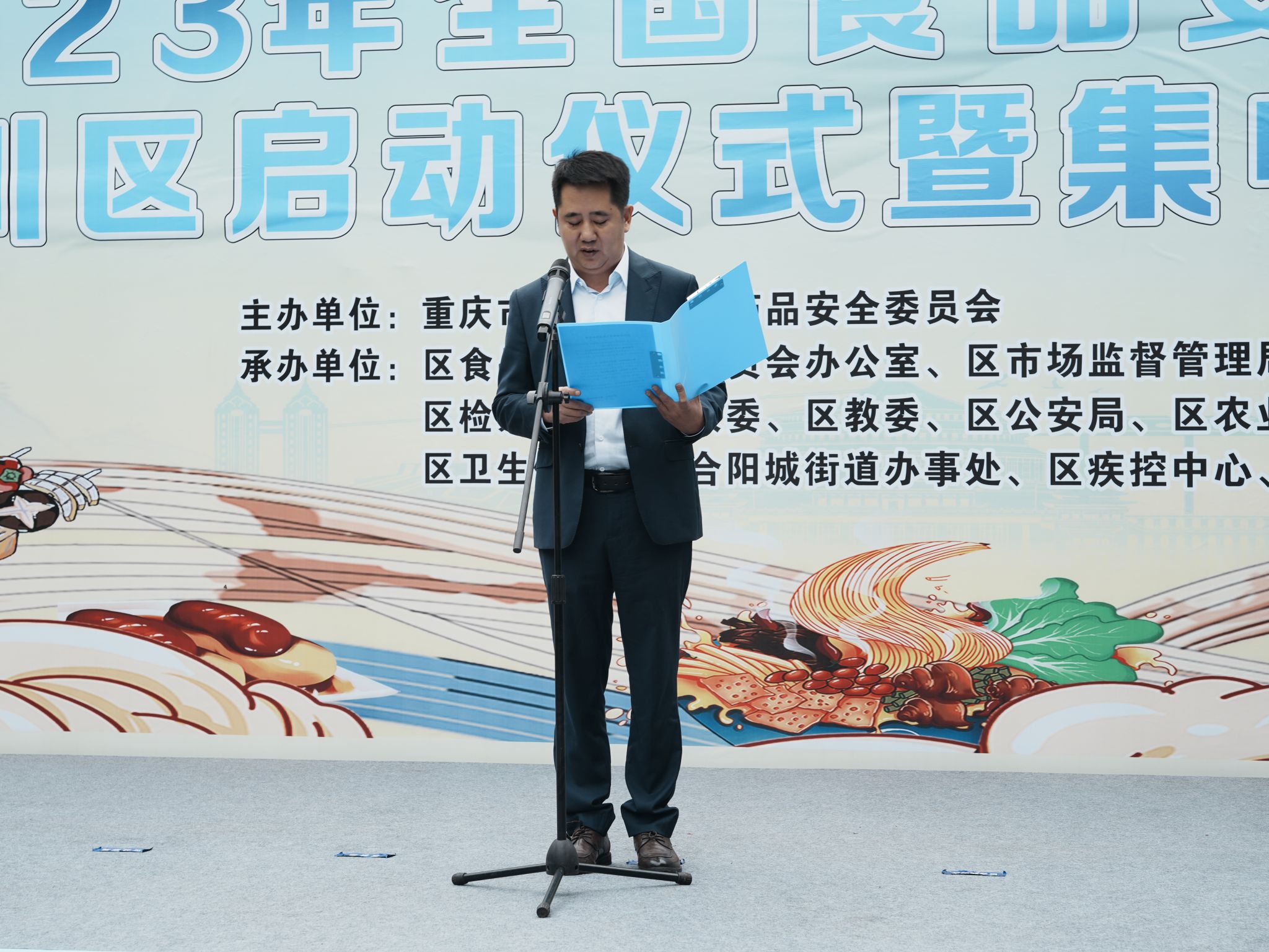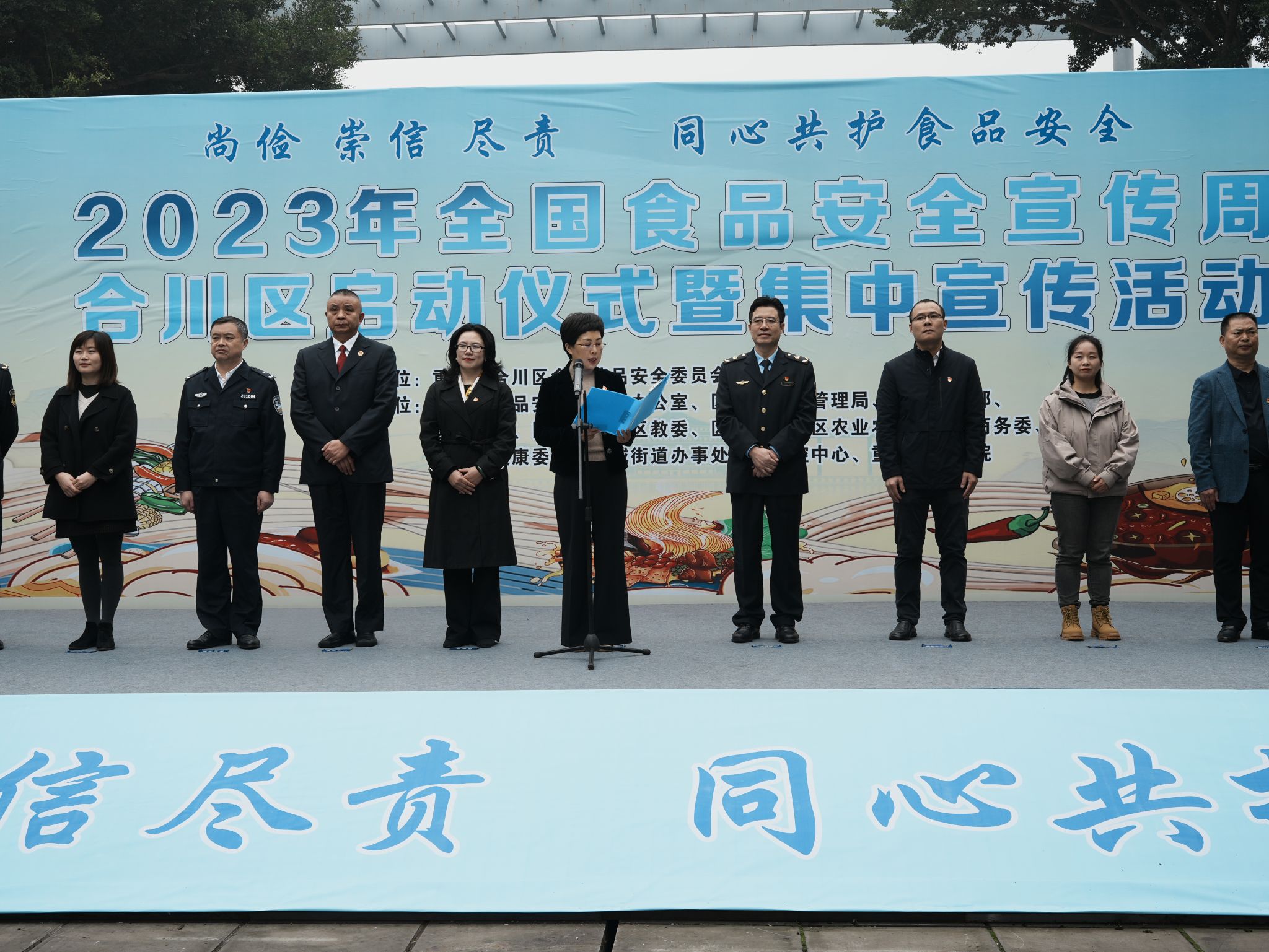 合川区政府副区长袁晓钦致辞。她提到,食品安全事关人民群众身体健康和生命安全,守护好食品安全,需要监管部门严格执法,也需要食品生产经营企业严格自律,更需要广大人民群众的积极参与。各部门要落实四个最严要求,牢牢守住食品安全底线,落实主体责任。共同营造安全、放心的食品安全环境。推动全区食品安全形势持续稳定向好,各食品生产经营企业更要增强守法意识。