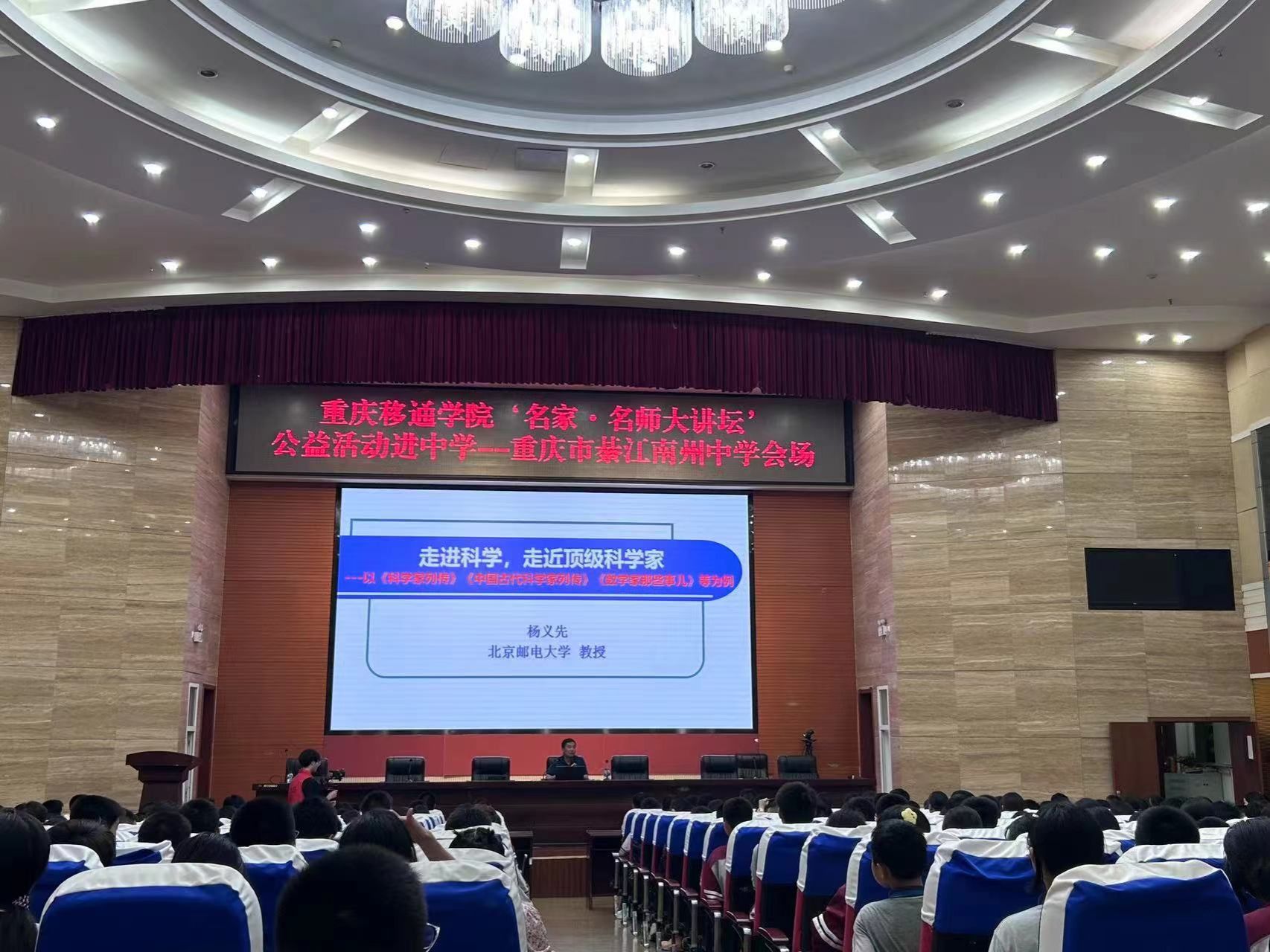 5. 綦江南州中学 6月19日,“‘名家·名师大讲坛’公益讲座诚挚走入中学校园”第三期活动在重庆市綦江南州中学举行。北京邮电大学杨义先教授带领现场450余名师生走进科学,走进顶尖科学家,领略科学精神。讲座最后,杨义先教授向重庆市綦江南州中学图书馆捐赠了其著作《科学家列传》《数学家那些事》。