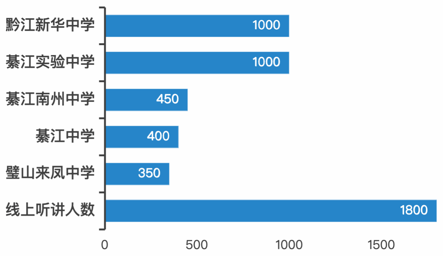 2024年5月-6月,“名家·名师大讲坛”公益讲座进中学活动共举办5场,吸引线上线下约5000余名师生听讲。现场听讲人数约3200人,其中璧山来凤中学350人,綦江中学400人,綦江南州中学450人,綦江实验中学1000人,黔江新华中学1000人;线上听讲人数约1800人。