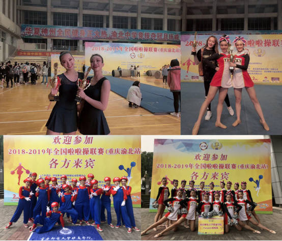 11月2日-4日,2018-2019年全国啦啦操联赛(重庆渝北站)在渝北中学盛大举行,我校啦啦操队21位队员在王尚傲教练的带领下报名参加公开青年丙组2016版示范套,自由舞蹈,双人花球自选动作,双人爵士自选动作,双人街舞自选动作项目。最终在各方角逐中脱颖而出,喜获三项冠军,一项亚军,一项第四名的佳绩。