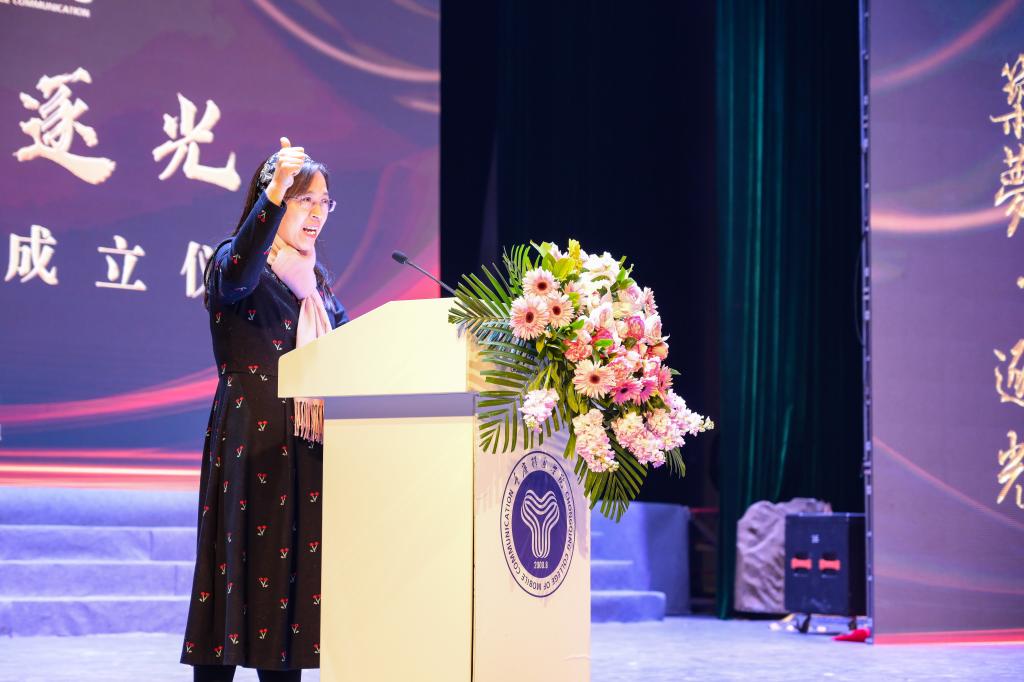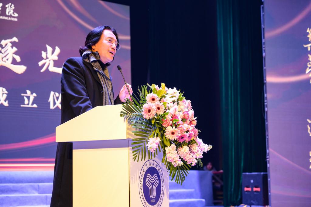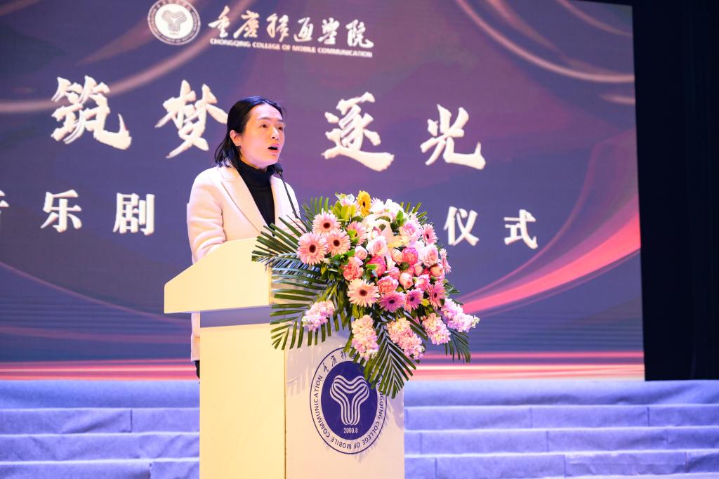 成立仪式上,重庆市戏剧家协会秘书长徐冀代表重庆市戏剧家协会作开场致辞。她谈到,习近平总书记在中国文联第十一次代表大会、中国作协第十次代表大会发表了重要讲话,为新时代中国特色社会主义文艺事业繁荣发展指出了光明前景,提供了根本遵循。徐秘书长认为,重庆移通学院是有文化责任、文化担当和文化自信的优秀大学,在学校师生深刻领悟习近平总书记重要讲话精神的基础上,音乐剧中心呼之而出,对全体师生而言,是喜上加喜的大事。她希望热爱戏剧、热爱音乐剧的青年朋友要心系民族复兴伟业,热情歌唱新时代新征程的恢宏气象;借助移通学院音乐剧中心大平台,用亮丽的嗓音、热烈的舞蹈讲好中国故事,向世界展现可信、可爱、可敬的中国形象,在民族伟大复兴的征程上尽情歌,欢乐舞。