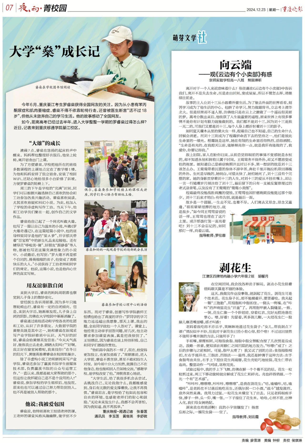 12月23日,重庆晚报以《大学“燊”成长记》为题,半版刊登了重庆移通学院綦江校区罗睿燊同学在学校的蜕变和成长。在文章最后的通讯员署名中,出现了新闻采写产业学院綦江校区研修班学员李玉莲、黄继英、李舒微的名字。3名同学经过长达一周的采写,成稿作品登上了省级报刊媒体。