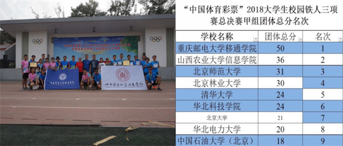 6月2日-3日,2018大学生校园铁人三项总决赛在中国石油大学(北京)举行。本次比赛男女各设5个项目,分别是小轮车两项、滑轮两项、轮滑三项、水陆两项以及小轮车三项,来自全国各省(市)的48所高校,共计327名选手参加了角逐,其中不乏清华大学、北京大学、中山大学等名校。我校派出李游、黄静两位教练率队参赛,经过两天的激烈比拼,最终,我校铁人三项队以绝对性的优势夺得本次比赛甲组团队第一名。