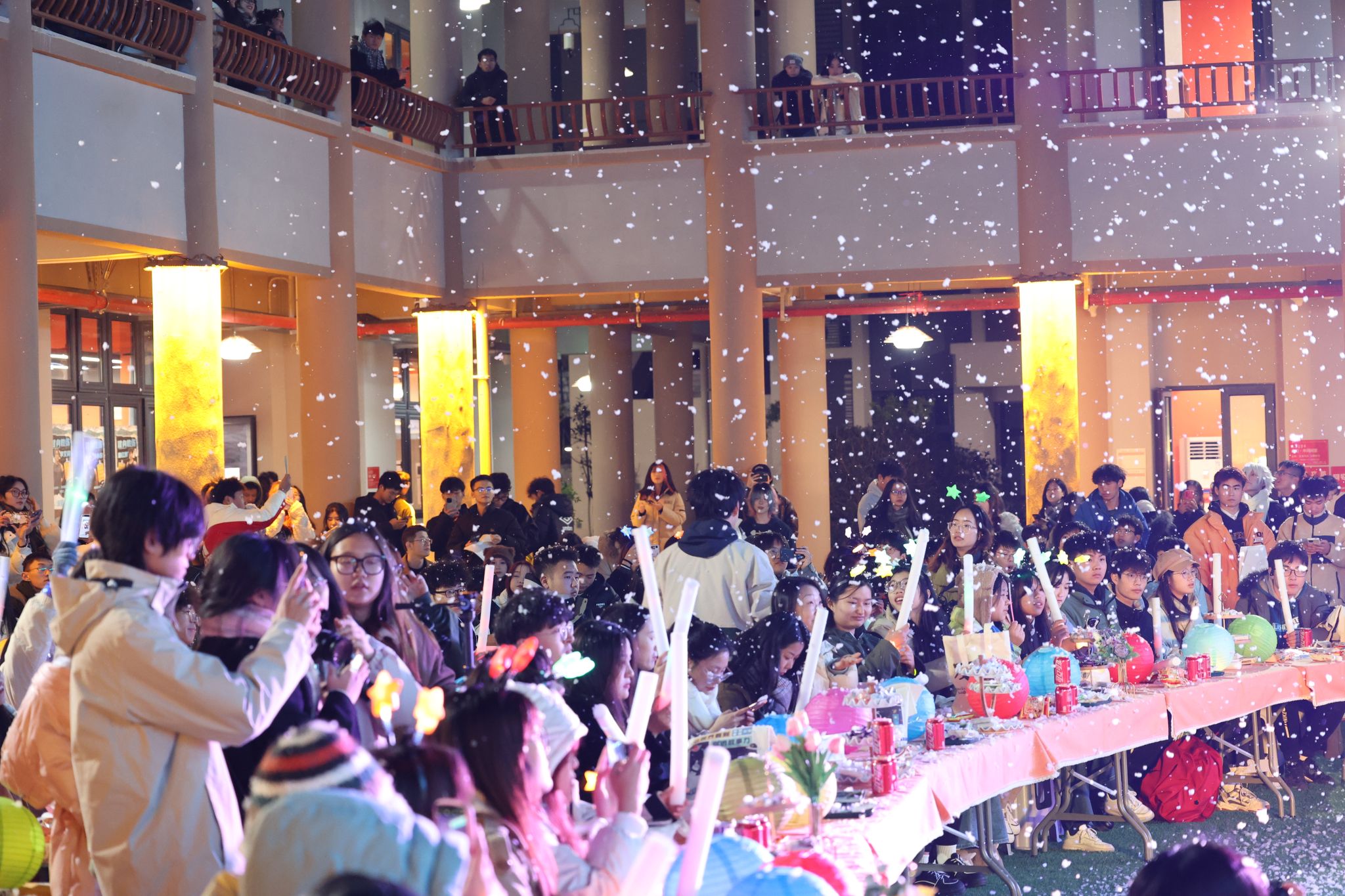 移步激情四射的蹦迪区,在书院也有“打碟”新体验。同学们纷纷卸下压力,共同沉浸在这场大雪纷飞的音乐盛宴中。而当冬季碰撞上“孜然味”,当书院师生邂逅新春手工,奇妙的“荷尔蒙”在此迸发。烧烤区人潮涌动,大家享受着书院人专属的美食一刻,You can手工区的学子们大胆尝试,创意迸发。师生朋辈间自由畅谈,在现场火热的气氛中交流,感受书院家文化的魅力。