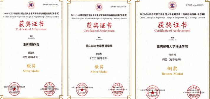 在近期结束的“2021-2022年度第三届全国大学生算法设计与编程挑战赛(冬季赛)”中,我校柯灵、肖江红老师指导的双体软件精英产业学院第22期学员龚江炜、胡崇均、杨官超在全国761所高校、6000余名参赛学生中斩获全国二等奖2项和全国三等奖1项。