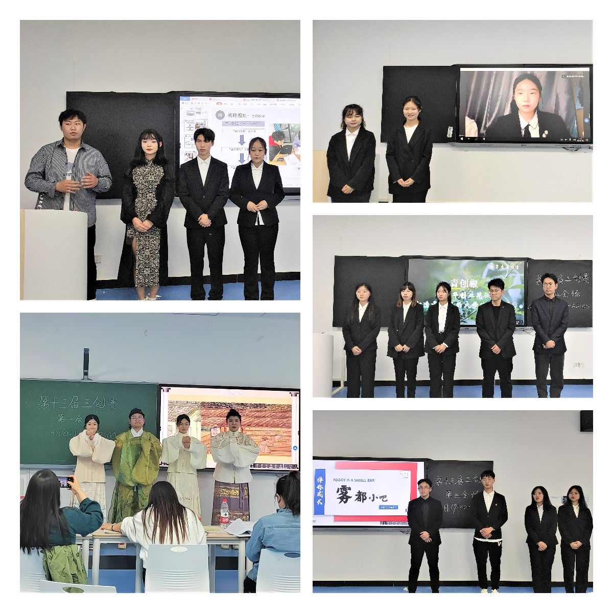 决赛于4月12日在合川校区5201、5202、5204、5205智慧教室举行,并于4月13日-4月15日进行为期三天的校赛决赛结果公示。决赛阶段,考虑到参赛团队既有合川校区团队,又有綦江校区团队,所以采用“线上+线下”的方式进行,合川校区团队线下参赛,綦江校区团队可线下,亦可线上参赛。遵循回避原则,决赛路演答辩分为3个会场,每个会场5位评委,每个会场11或12支路演答辩队伍。