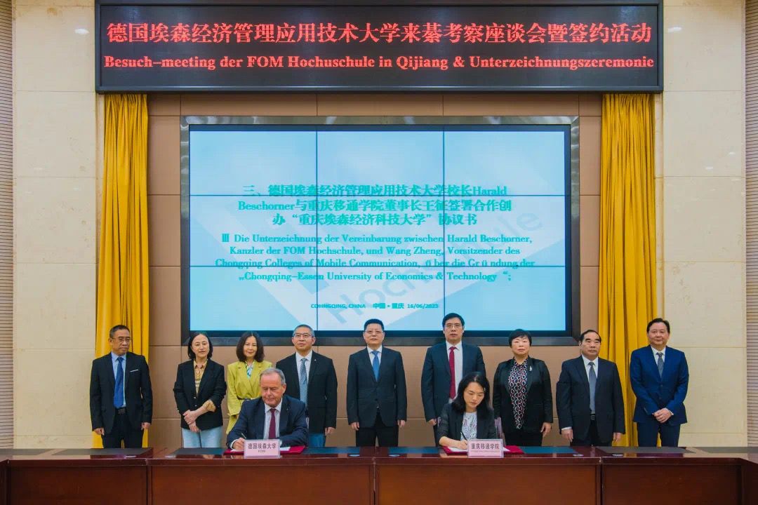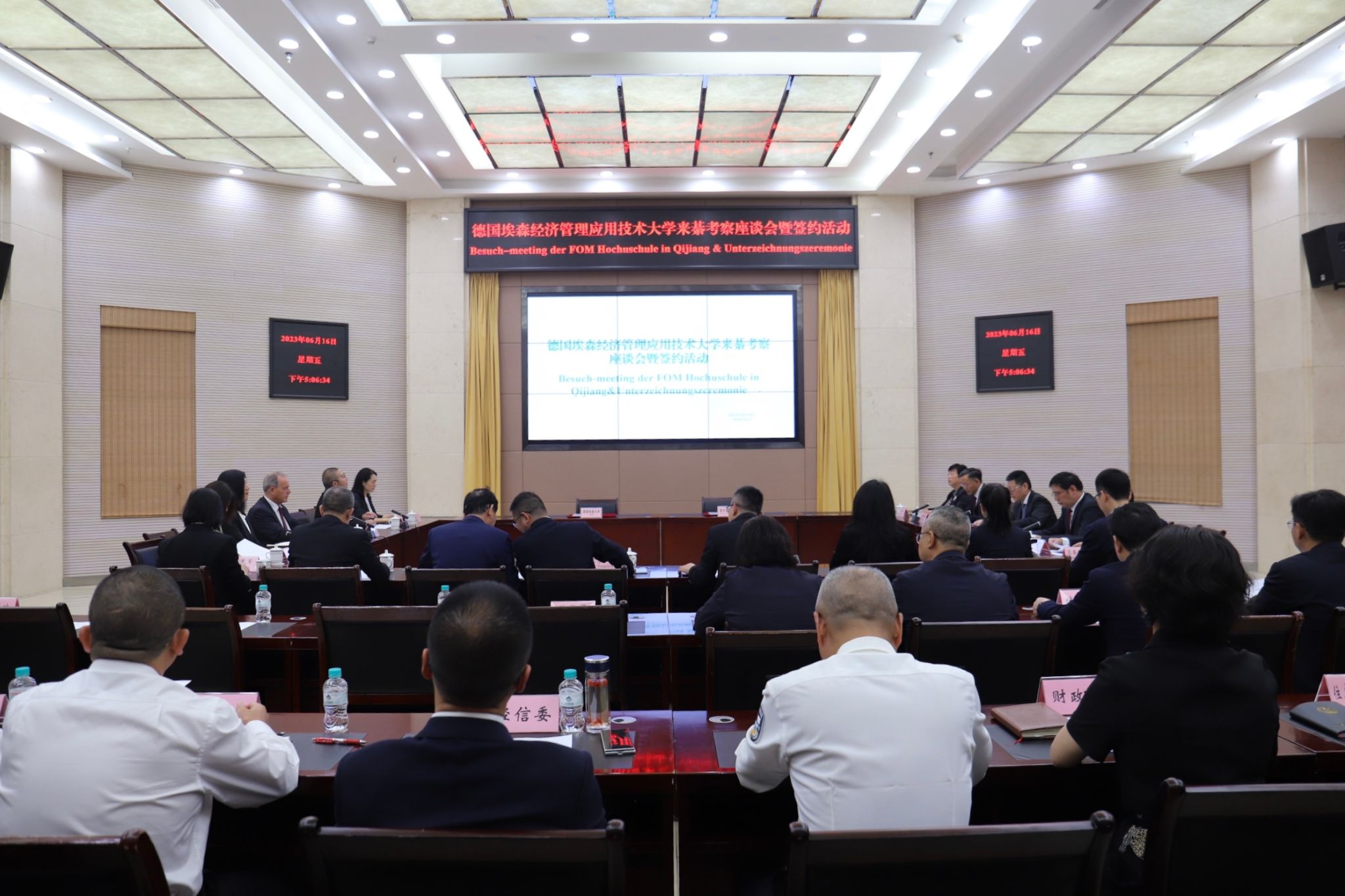 6月16日下午,德国埃森经济管理应用技术大学来綦考察座谈会暨签约活动举行。中国新商科大学教育集团联席董事长彭鸿斌,董事长陈晓莉,总裁王征,副总裁李茂军、尹邦满,校长张德民,常务副校长王永周,副校长张衍学,綦江区委书记姜天波,区委常委、区委办公室主任蔡鹏、副区长龚锐、陈贤,区政协一级巡视员王守华,以及区委教育领导小组成员单位相关负责人等参加座谈暨签约仪式。