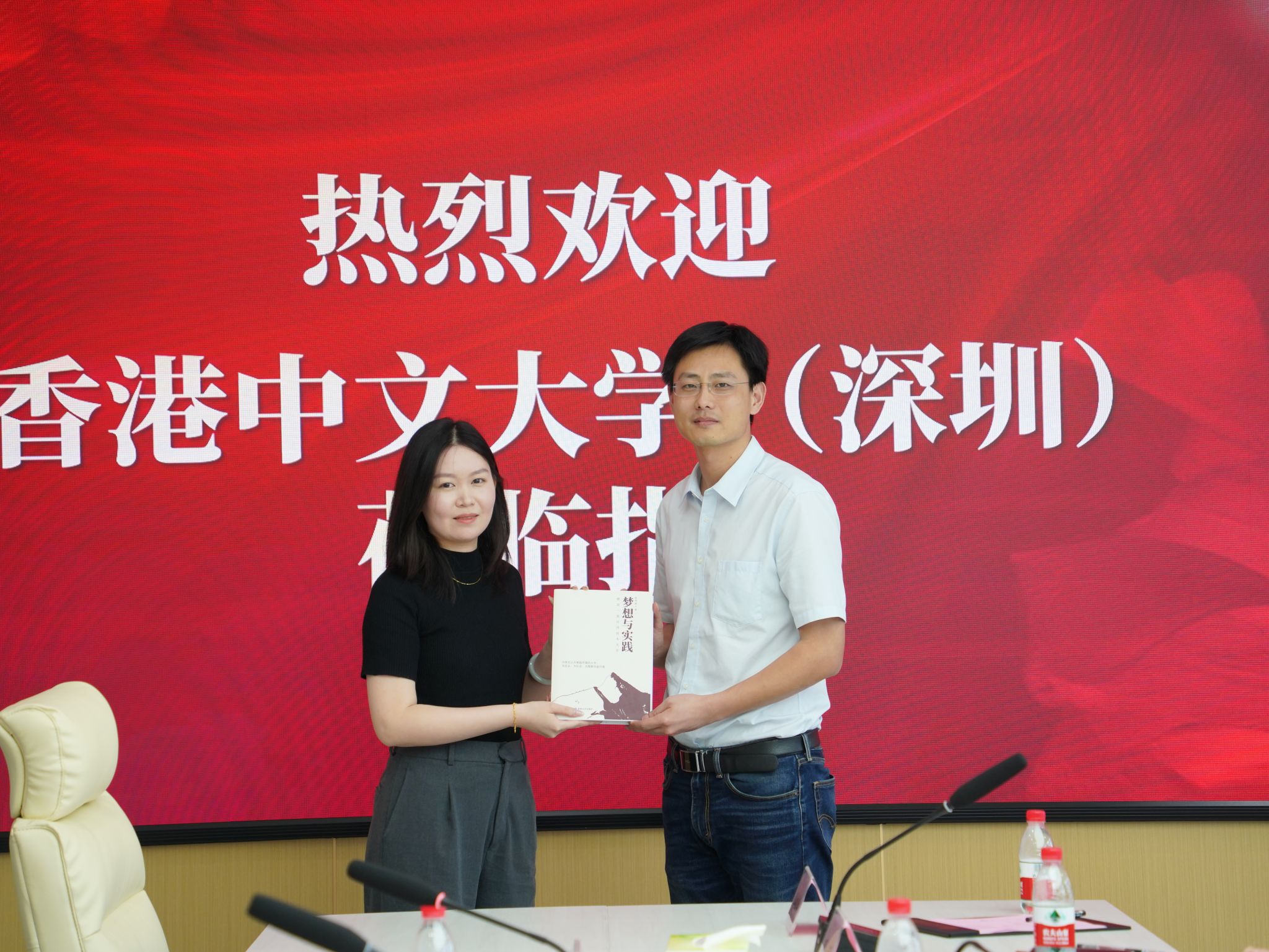 我校常务副校长周伟向香港中文大学(深圳)祥波书院一行赠董事长彭鸿斌《梦想与实践》一书。