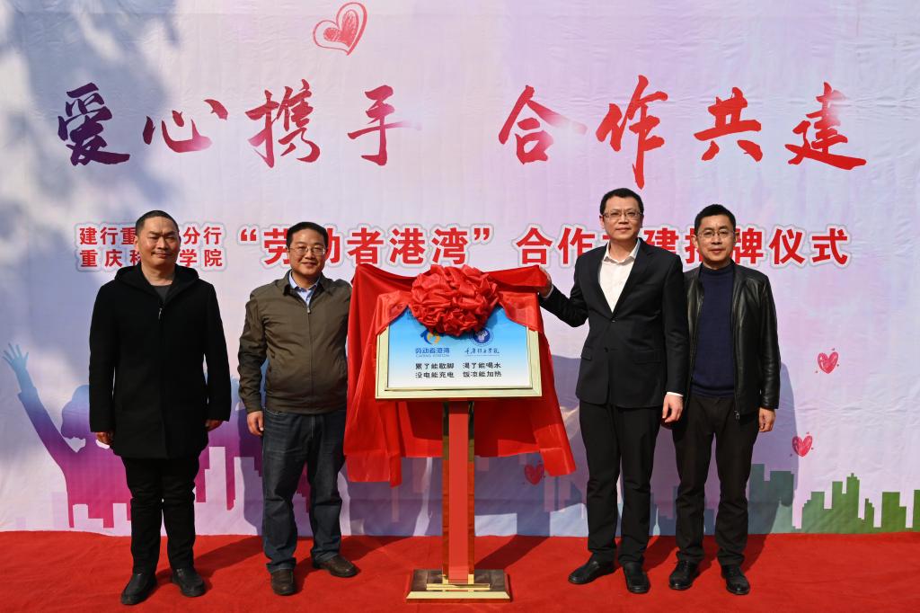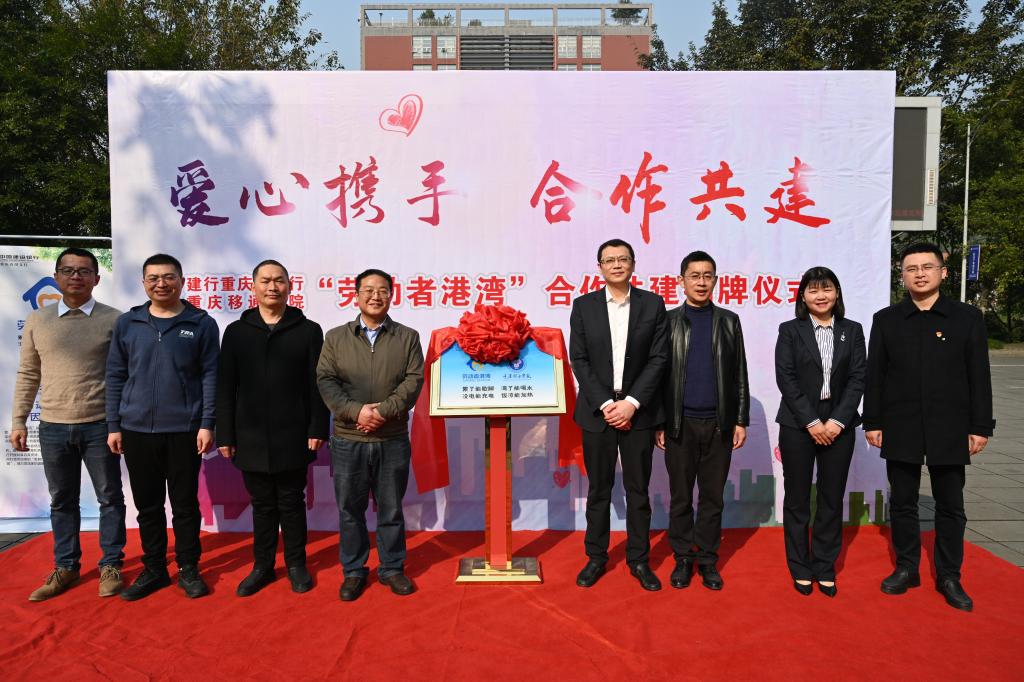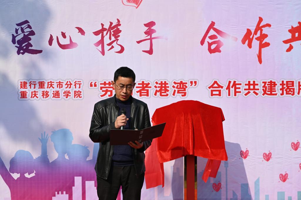 随后,移通学院校长助理尹浩亮、建行重庆市分行甘润副总为“劳动者港湾”合作共建共同揭牌,现场掌声雷动,气氛热烈。