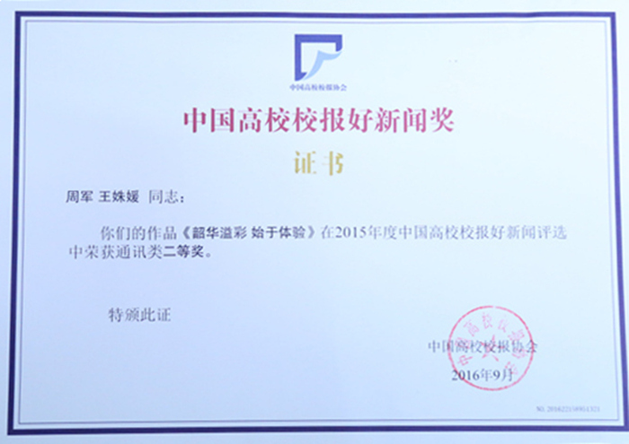 近日,2015年度全国高校校报好新闻奖评选揭晓,我校报送的作品《韶华溢彩 始于体验》(作者:周军、王姝媛)荣获新闻通讯类二等奖。