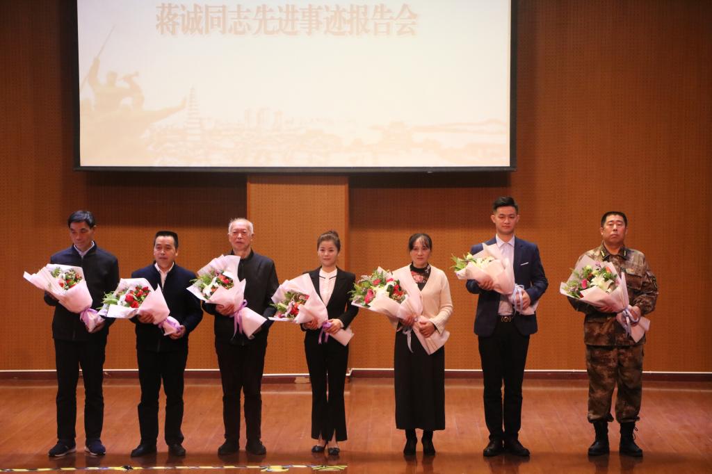 报告会上,参会人员还集中观看了中央电视台新闻频道《24小时》栏目“今夜面孔”专栏对蒋诚的专题报道。报告结束时,大学生青年代表向报告团全体成员和嘉宾敬献了鲜花。