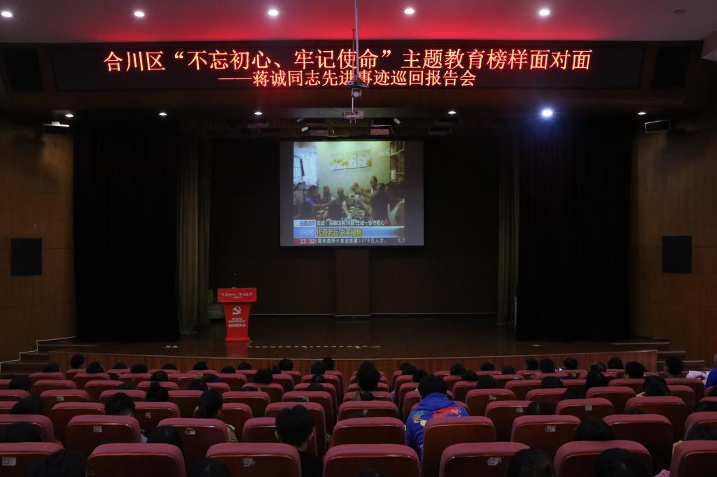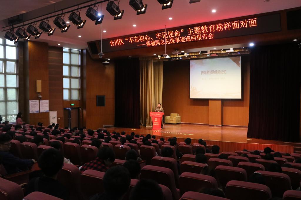 在全校上下扎实开展“不忘初心、牢记使命”主题教育的重要时刻, 11月7日下午,合川区“不忘初心、牢记使命”主题教育榜样面对面—蒋诚同志先进事迹巡回报告会走进我校在下里巴人剧院举行。在合高校300余名师生现场接受了一场心灵的洗礼,也是开展革命传统教育“讲红色故事、讲革命精神”活动的具体举措。