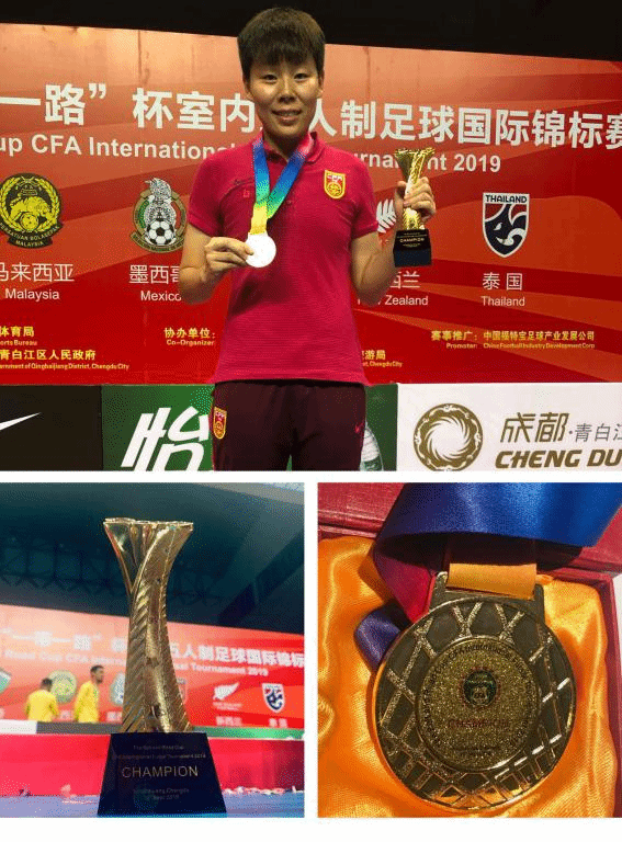 这是我第一次代表中国室内五人制女足国家队参加国际A级赛事。此次赛事cctv也进行了相关的直播。也是中国室内五人制足球国家队从2009年-2019年十年磨一剑的时间首次夺冠。从小时我就梦想着有一天能够代表国家队参加比赛,为国争光。在经过今年七期国家队选拔到最后确定22人大名单,直到最终确定比赛报名14人。在这段集训日子里,面对压力与困难,我牢记自己是一名移通足球教练,我的行动代表着学校,影响着我的队员。所以我通过自己每一次的坚持与努力,最终进入最后14人名单。并以三场全胜战绩赢的冠军。此次对手泰国队是亚洲室内武道会的冠军两年前曾5:2赢了我们,这一次我们同样以5:2的比分回报了对手!